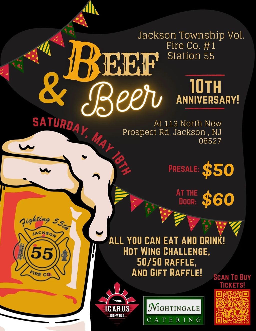 The 10th annual Beef and Beer event happening on Saturday, May 18, 2024, at the Jackson Township Fire Company 1 Station 55, at 113 North New Prospect Road, Jackson, New Jersey. Get ready for a night filled with delicious beef dishes catered by Nightingale Catering and Icarus Brewing beer!